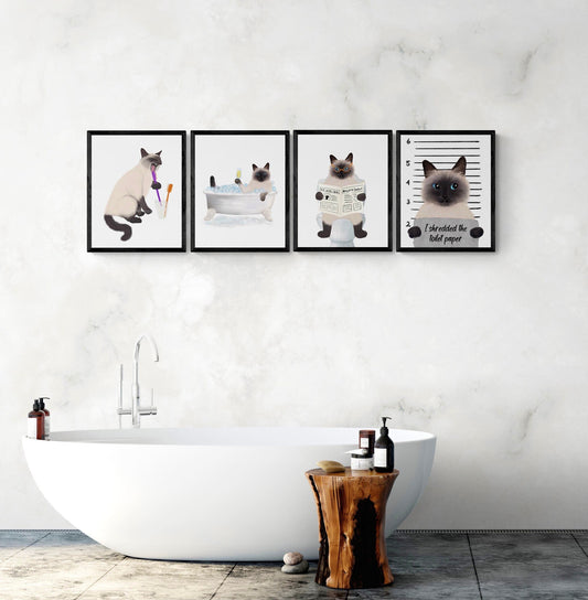 Himalayan Cat Bathroom Art Set of 4, Bathroom Wall Decor, Cute Himalayan Cat In Bath Art, Cat On Toilet Print, Cat Lover Gift, Cat Spa Day