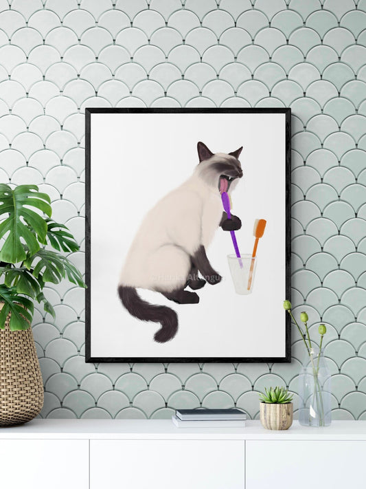 Himalayan Cat Licking Toothbrush, Naughty Cat Brushing Teeth, Bathroom Art, Bathroom Cat Painting, Cat In Bath Print, Cat Lover Gift
