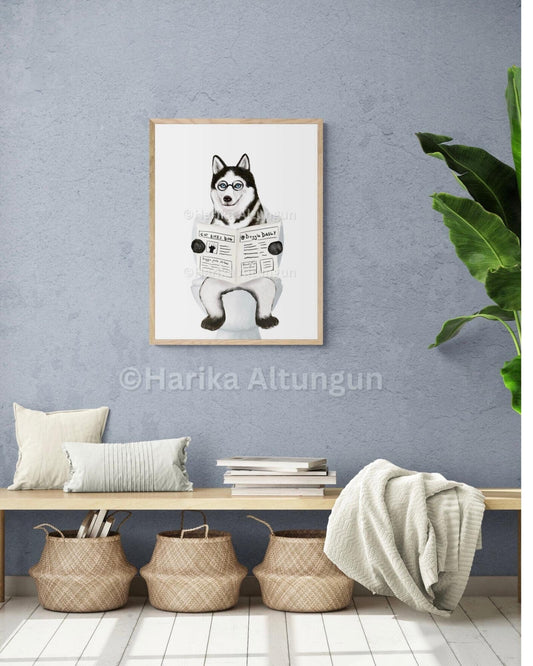 Husky On Toilet Print, Dog In Bathroom, Animal Bathroom Wall Art, Dog Memorial Painting, Dog In Bath Print, Pet Mom Dad Gift