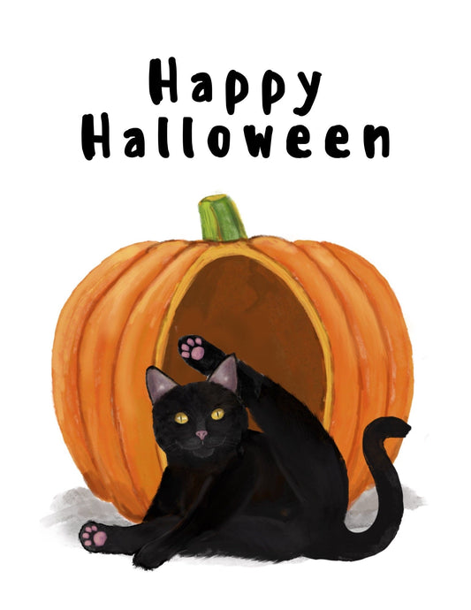Black Cat and Pumpkin Print, Halloween Cat Painting, Black Cat Portrait, Holiday Wall Art, Black Cat Licking Himself Art