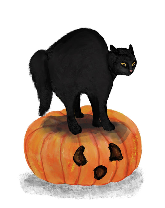 Scared Black Cat on Pumpkin Print, Halloween Cat Painting, Black Cat Portrait, Holiday Wall Art, Defensive Black Cat