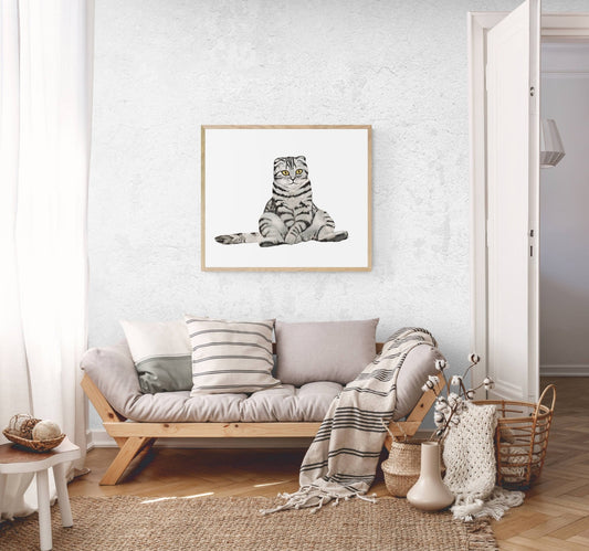 Scottish Fold Tabby Cat Print, Original Gray Cat Painting, Gray Cat Art, Kitten Painting, Cat Lover Gift, Living Room Wall Art