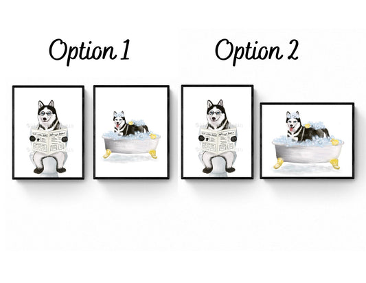 Set of 2 Siberian Husky In Bath Prints, Dog Sitting on Toilet Print, Bathroom Dog Painting, Dog Reading Newspaper Print, Husky Lover Gift