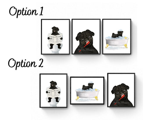 Set of 3 Black Pug In Bath Prints, Dog Sitting on Toilet Print, Bathroom Dog Painting, Dog Reading Newspaper Print, Pug Lover Gift