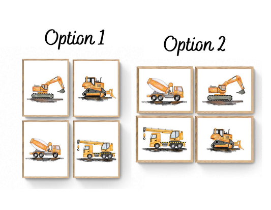 Set of 4 Construction Vehicle Prints, Horizontal Vertical Construction Wall Art, Boys Room Poster, Crane, Cement Truck, Excavator, Bulldozer