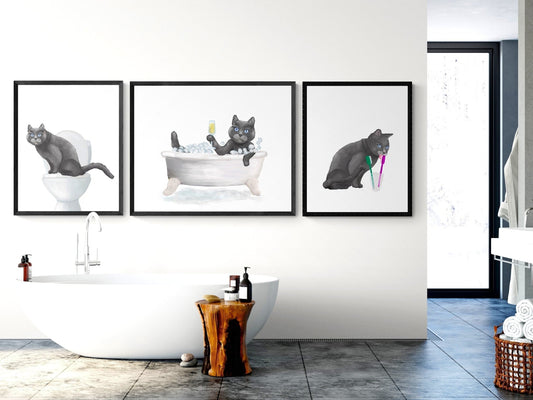 Set of 3 Gray Cat Bathroom Wall Art, Bathroom Wall Decor Set, Cute Gray Cat In Bath Art, Scottish Cat On Toilet Print, Cat Lover Gift, Cat