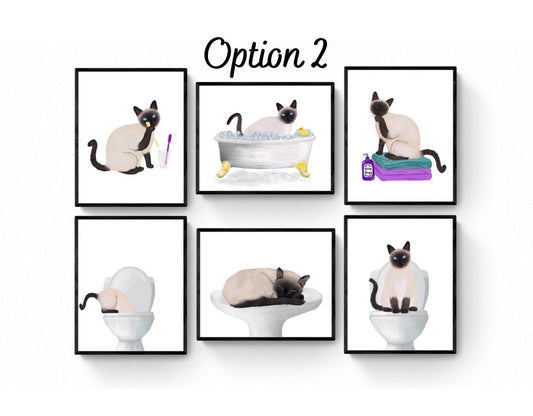 Siamese Cat Bathroom Art Set of 6, Bathroom Wall Decor Set, Cute Black Cat In Bath Art, Cat On Toilet Print, Cat Lover Gift, Cat Spa Day