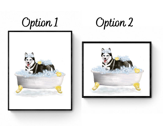 Siberian Husky In Tub Print, Bathing Husky Print, Bathroom Dog Painting, Dog Relaxing In Bath Print, Husky Lover Gift, Dog Mom Dad Gift,