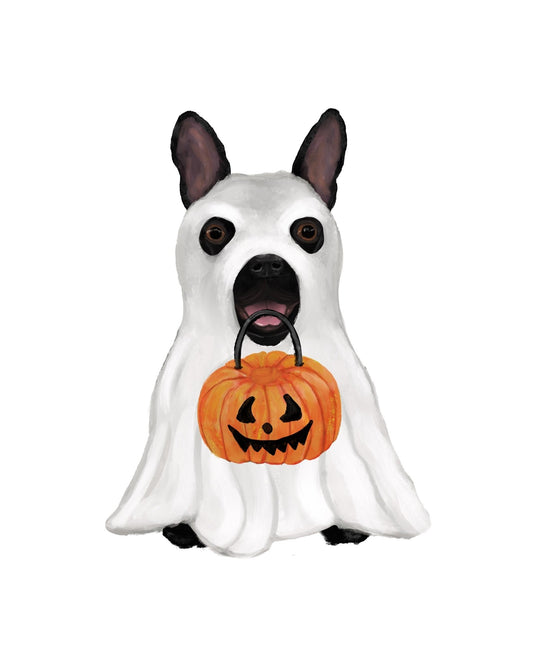 Black French Bulldog with Ghost Costume Print, Halloween Dog Painting, Jack o Lantern, Holiday Wall Art, Fall Autumn Wall Print