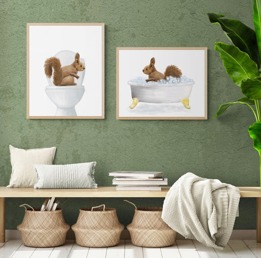 Squirrel in Bathroom Set of 2 Print, Animals In Bathtub and on Toilet Art, Squirrel Relaxing In Bath Artwork, Backyard Animals, Animal Lover