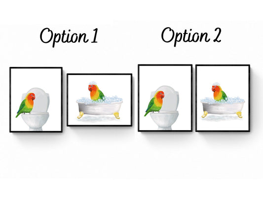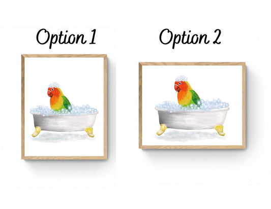 Tropical Lovebird Bathroom Print Set of 2, Parrot In Bathtub, Bathroom Wall Art, Bird Memorial Painting, Birdwatcher gift, Bird Lover Art