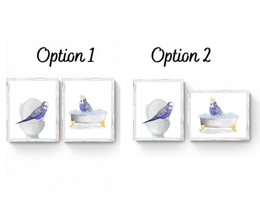 Violet Budgie Bathroom Print Set of 2, Purple Parakeet On Toilet, Budgerigar In Bathroom, Animal Bathroom Wall Art, Bird Memorial Painting