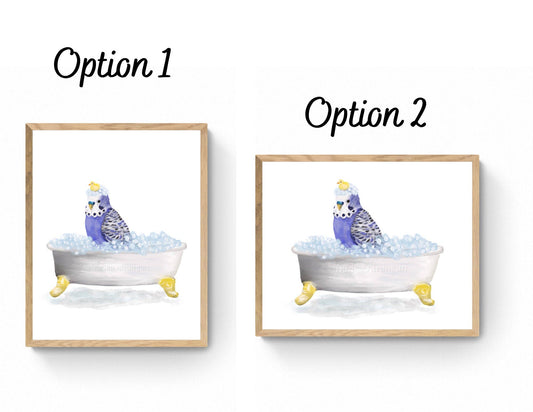 Violet Parakeet Bathing Print, Purple Budgie In Bathtub, Budgerigar Art, Bird Memorial Painting, Bird Relaxing In Bath Print, Bird Lover Art