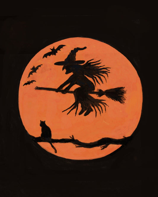 Witch Flying with a Broom Print, Halloween Cat Painting, Halloween Orange Moon Portrait, Holiday Wall Art, Flying with Bats Poster