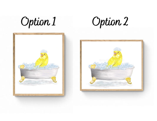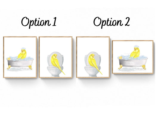 Yellow Parakeet In Bath Set of 2 Print, Budgie Artwork, Bathroom Wall Art, Bird Memorial Painting, Bird Relaxing In Bath Print, Bird Lover