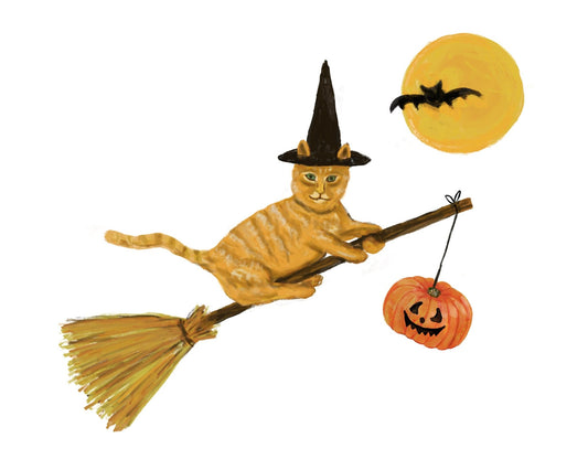 Ginger Cat Flying with a Broom Print, Halloween Cat Painting, Orange Tabby Cat Portrait, Holiday Wall Art, Orange Cat Flying with Bats
