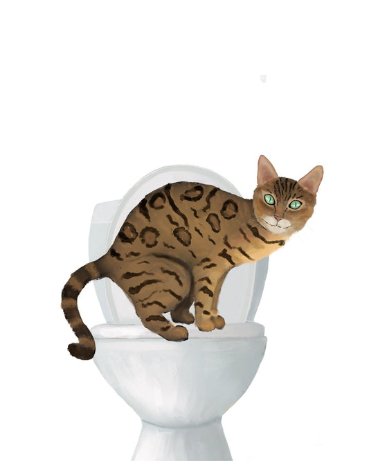Gold Bengal Cat On Toilet Art, Bathroom Art, Bathroom Cat Painting, Cat On Toilet Print, Cat Lover Gift