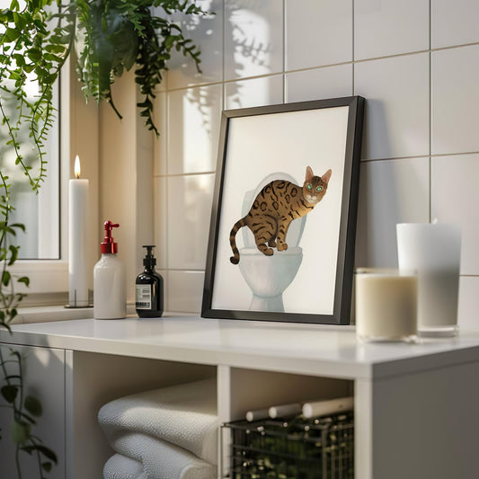 Gold Bengal Cat On Toilet Art, Bathroom Art, Bathroom Cat Painting, Cat On Toilet Print, Cat Lover Gift, Bathroom Cat Decor, Housewarming Gift
