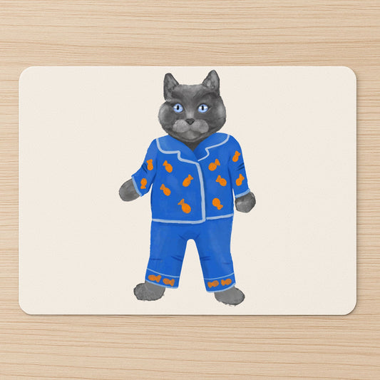 Gray Cat in Blue Pajamas – Cute and Playful Cat Art Print