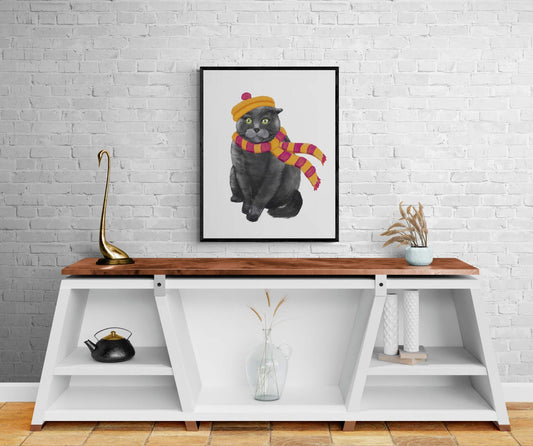 Gray Cat with Scarf Print, Pets in Fall Painting, Fall Decor, Living Room Home Wall Art, Holiday Art, Cat Illustration, Animal Lover Gift