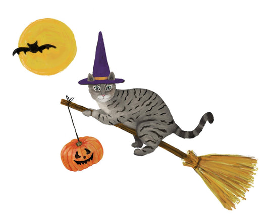 Gray Tabby Cat Flying with a Broom Print, Halloween Cat Painting, Orange Tabby Cat Portrait, Holiday Wall Art, Gray Cat Flying with Bats