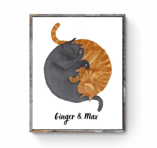 Customized Sleeping Gray And Orange Tabby Cat Print, Custom Cuddling Ginger and Gray Cat, Cat Illustration, Home Decor, Lazy Cat Painting