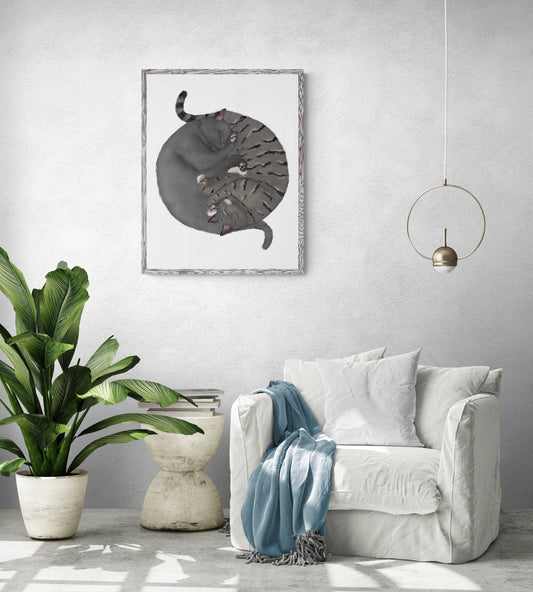 Customized Sleeping Black And Gray Tabby Cat Print, Custom Cuddling Gray and Black Cat, Cat Illustration, Home Decor, Lazy Cat Painting