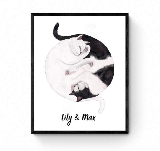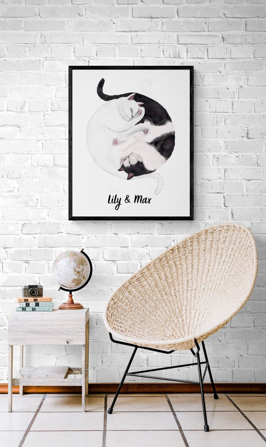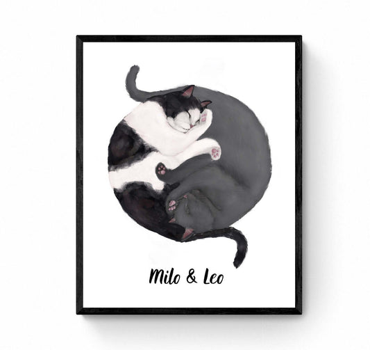Customized Sleeping Tuxedo And White Tabby Cat Print, Custom Cuddling Cats, Cat Illustration, Home Decor, Lazy Cat Painting, Pet Loss Gift
