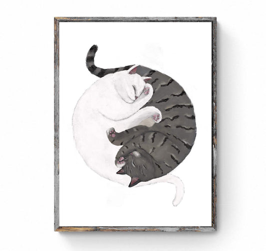 Customized Sleeping White And Gray Tabby Cat Print, Custom Cuddling Gray and White Cat, Cat Illustration, Home Decor, Lazy Cat Painting