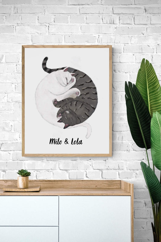Customized Sleeping Gray And Tabby Cat Print, Custom Cuddling Cats, Cat Illustration, Home Decor, Lazy Cat Painting, Pet Loss Gift