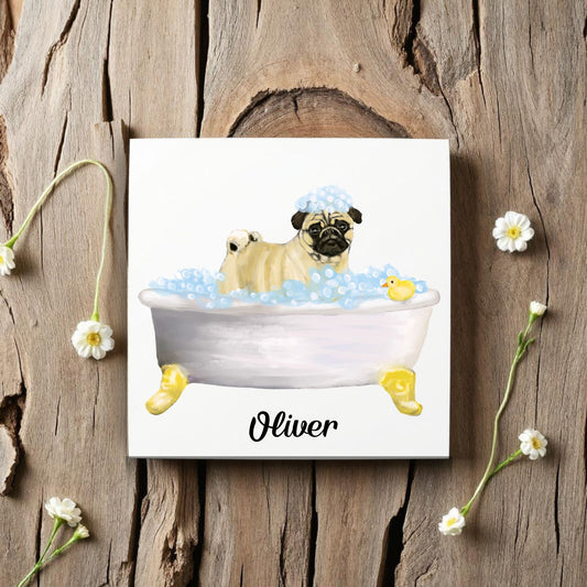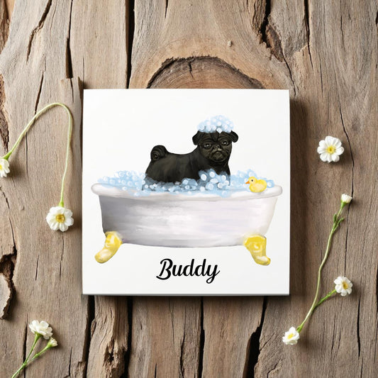 Pug Dog in Bathtub Ceramic Tile – Handcrafted Whimsical Pet Art Decor