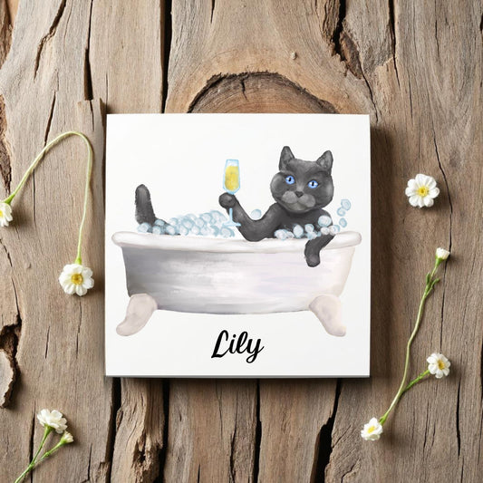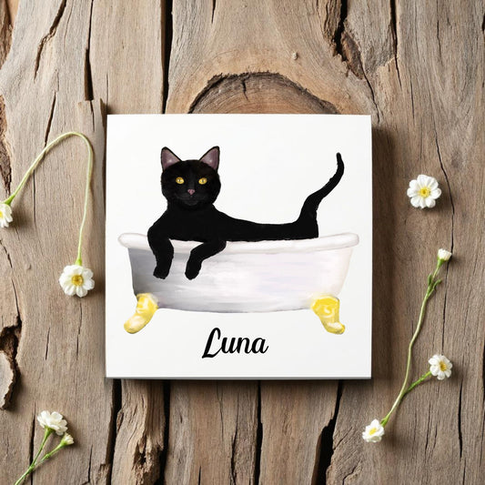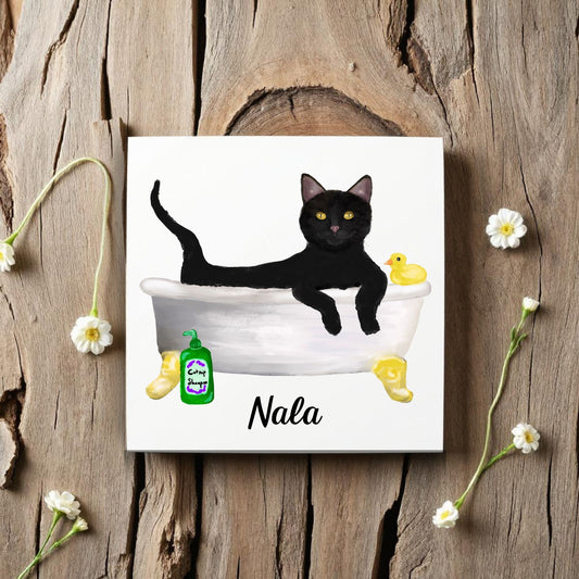 Black Cat in Bathtub Ceramic Tile – Handcrafted Whimsical Pet Art Decor