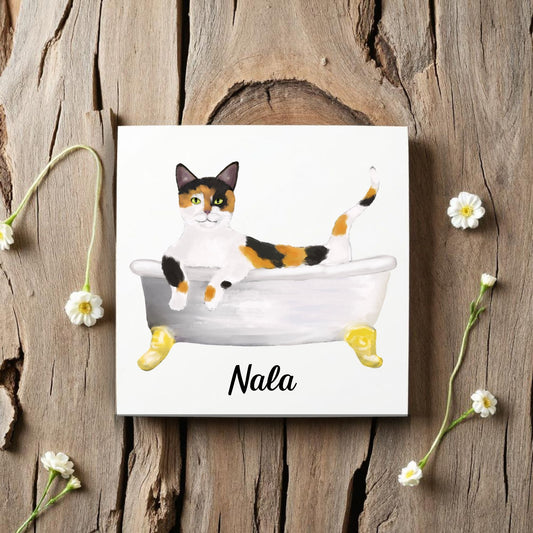 Calico Cat in Bathtub Ceramic Tile – Handcrafted Whimsical Pet Art Decor
