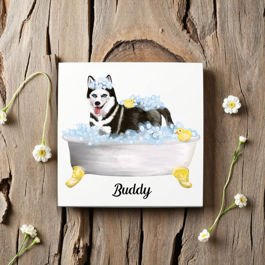 Husky Dog in Bathtub Ceramic Tile – Handcrafted Whimsical Pet Art Decor