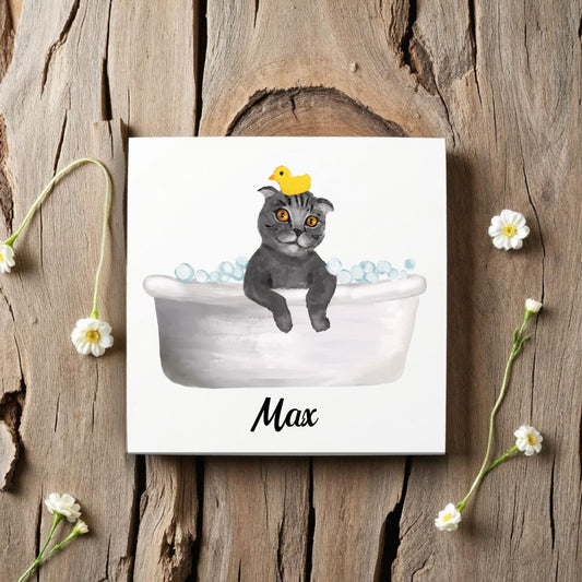 Scottish Fold Cat in Bathtub Ceramic Tile – Handcrafted Whimsical Pet Art Decor