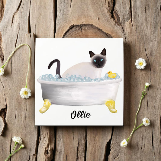 Siamese Cat in Bathtub Ceramic Tile – Handcrafted Whimsical Pet Art Decor