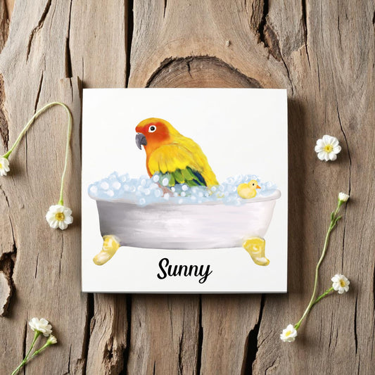 Sun Conure in Bathtub Ceramic Tile – Handcrafted Whimsical Bird Art Decor