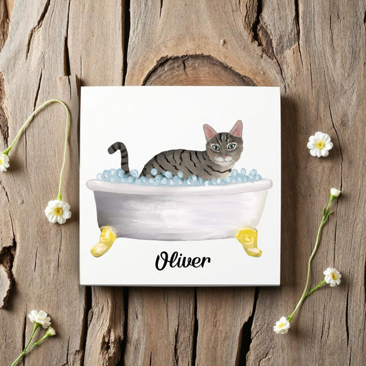 Tabby Cat in Bathtub Ceramic Tile – Handcrafted Whimsical Pet Art Decor