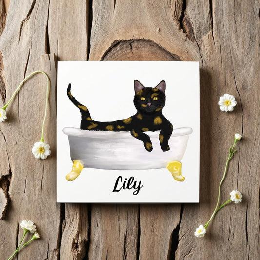 Tortoiseshell Cat in Bathtub Ceramic Tile – Handcrafted Whimsical Pet Art Decor
