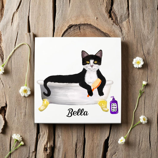 Tuxedo Cat in Bathtub Ceramic Tile – Handcrafted Whimsical Pet Art Decor