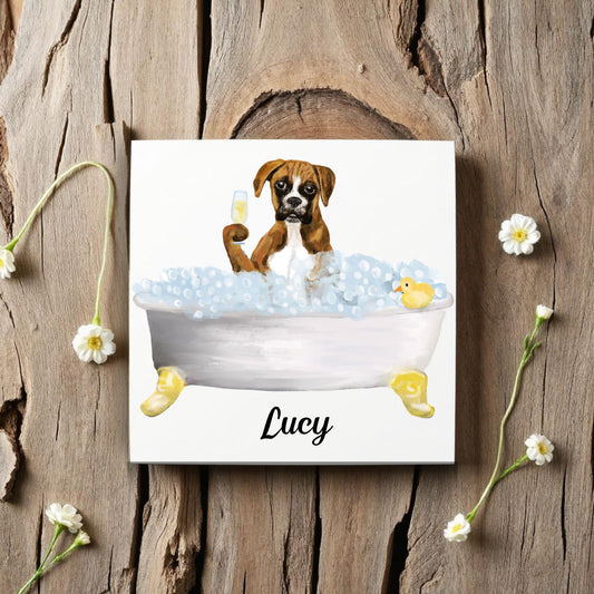 Boxer Dog in Bathtub Ceramic Tile – Handcrafted Whimsical Pet Art Decor