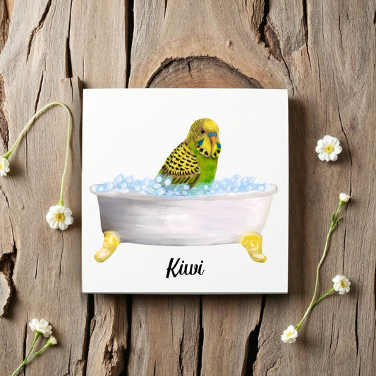 Budgie in Bath Ceramic Tile – Handcrafted Whimsical Bird Decor