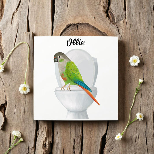 Green Cheek Conure on Toilet Ceramic Tile – Handcrafted Whimsical Bird Decor