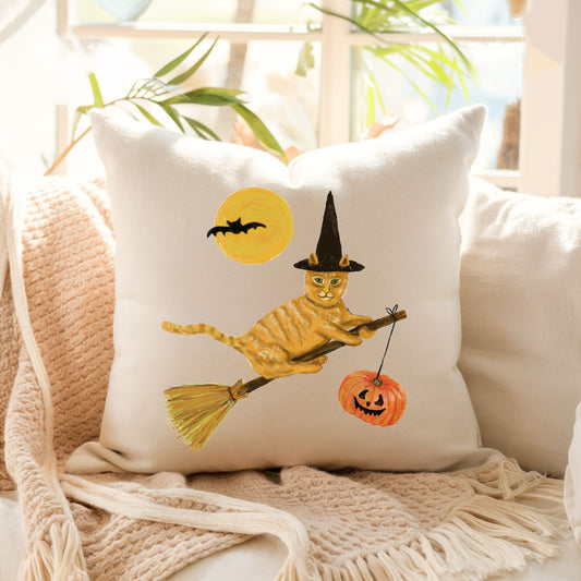 Halloween Orange Tabby Witch Cat Pillow