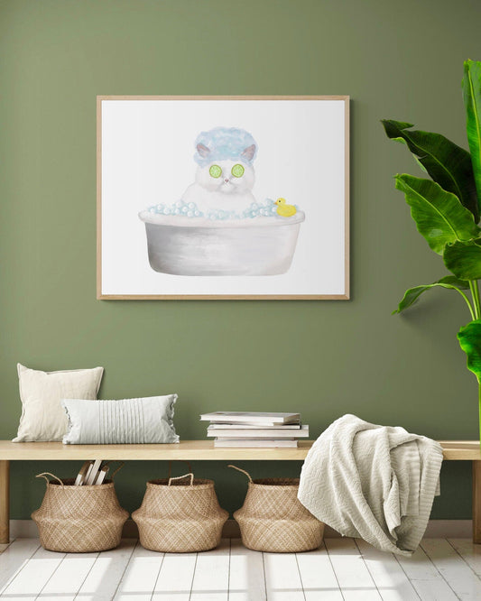 White Cat Spa Day Art Print – Relaxing Cat Lover Wall Decor