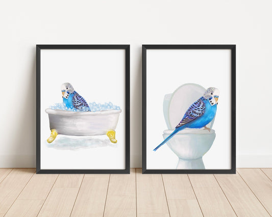 Blue Budgie Bathtub and Toilet Art Print Set of 2 – Humorous Bathroom Decor
