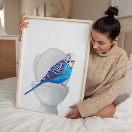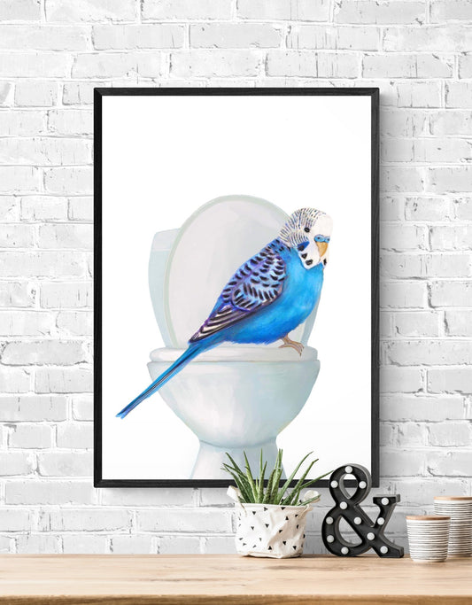 Blue Budgie Toilet Art Print – Whimsical Bird Bathroom Decor