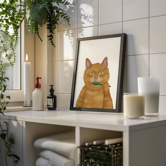 Ginger Cat Brushing Teeth – Fun Orange Cat Art Print