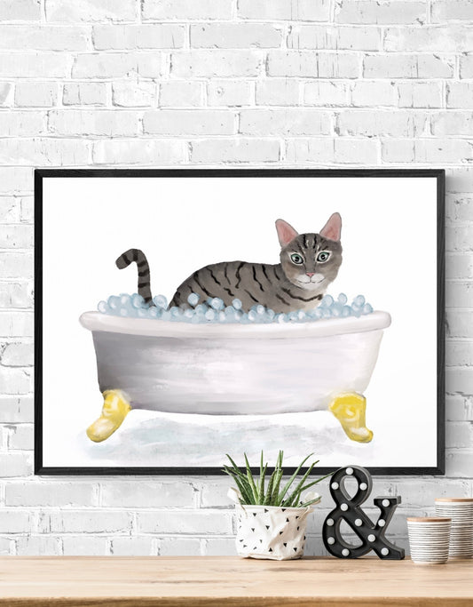 Gray Tabby Cat in Bathtub Art Print – Playful Bathroom Wall Decor