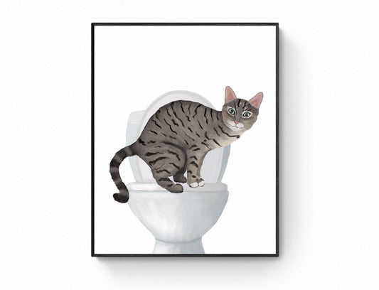 Gray Tabby Cat on Toilet Art Print – Whimsical Bathroom Decor